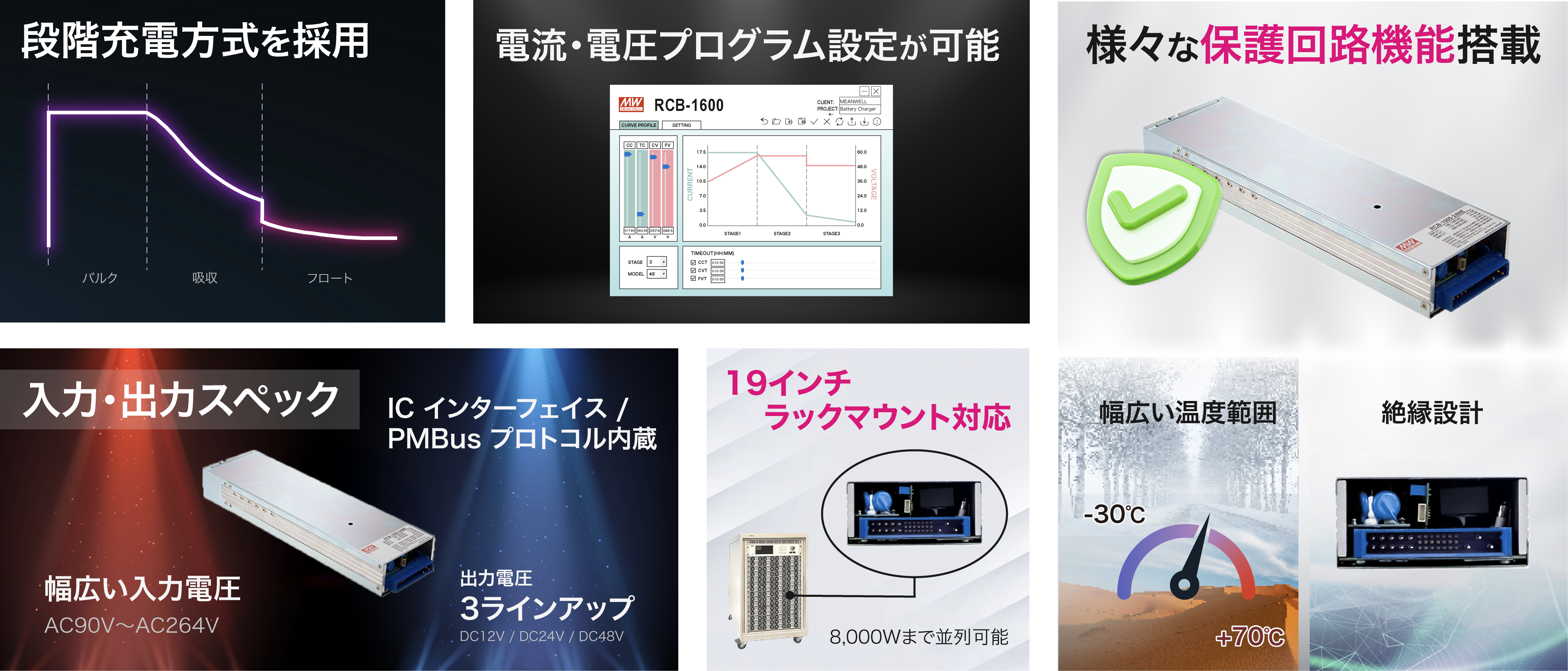 RCB Seriesは19インチラックマウント1U対応の1,600Wクラスのバッテリー充電器です。