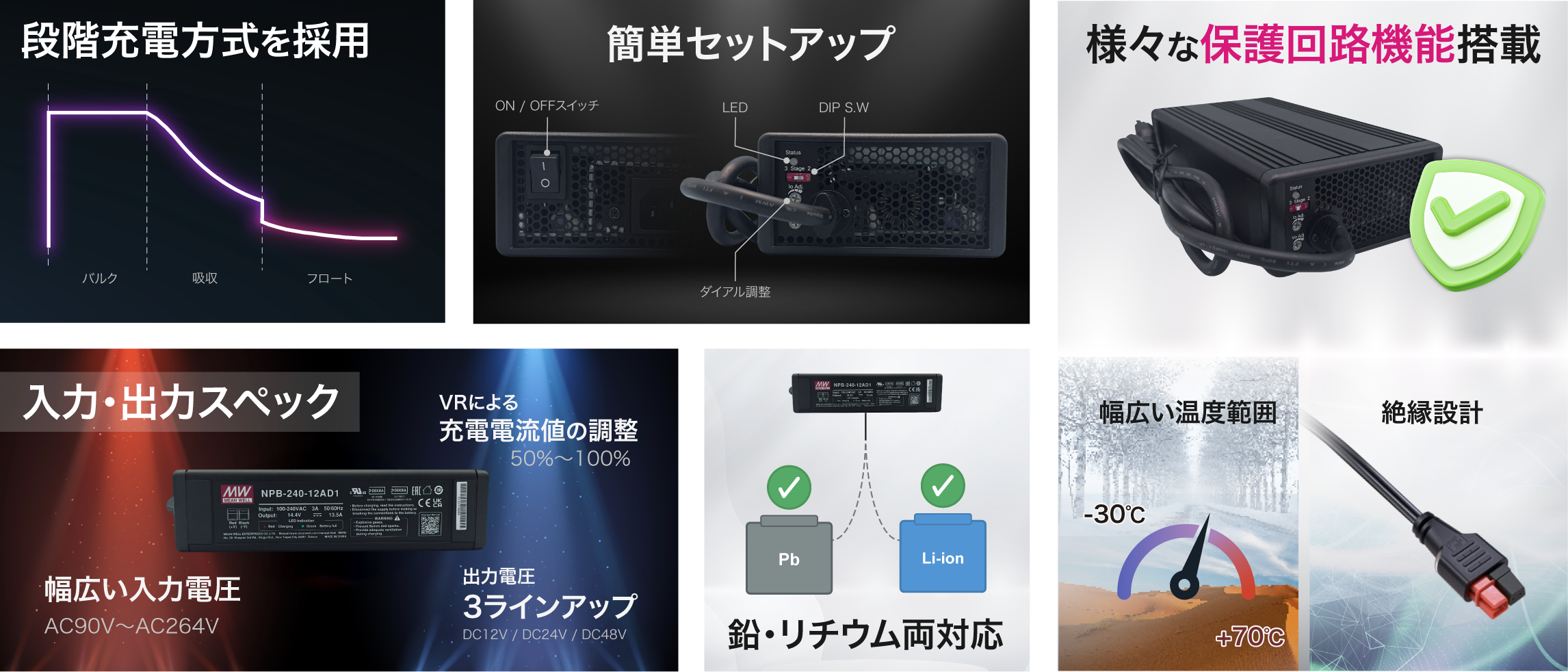 鉛バッテリー・リチウムイオンバッテリーどちらにも使用可能で、バッテリー寿命を伸ばす段階充電の搭載やダイヤルにて簡単に電流調整を行えます。