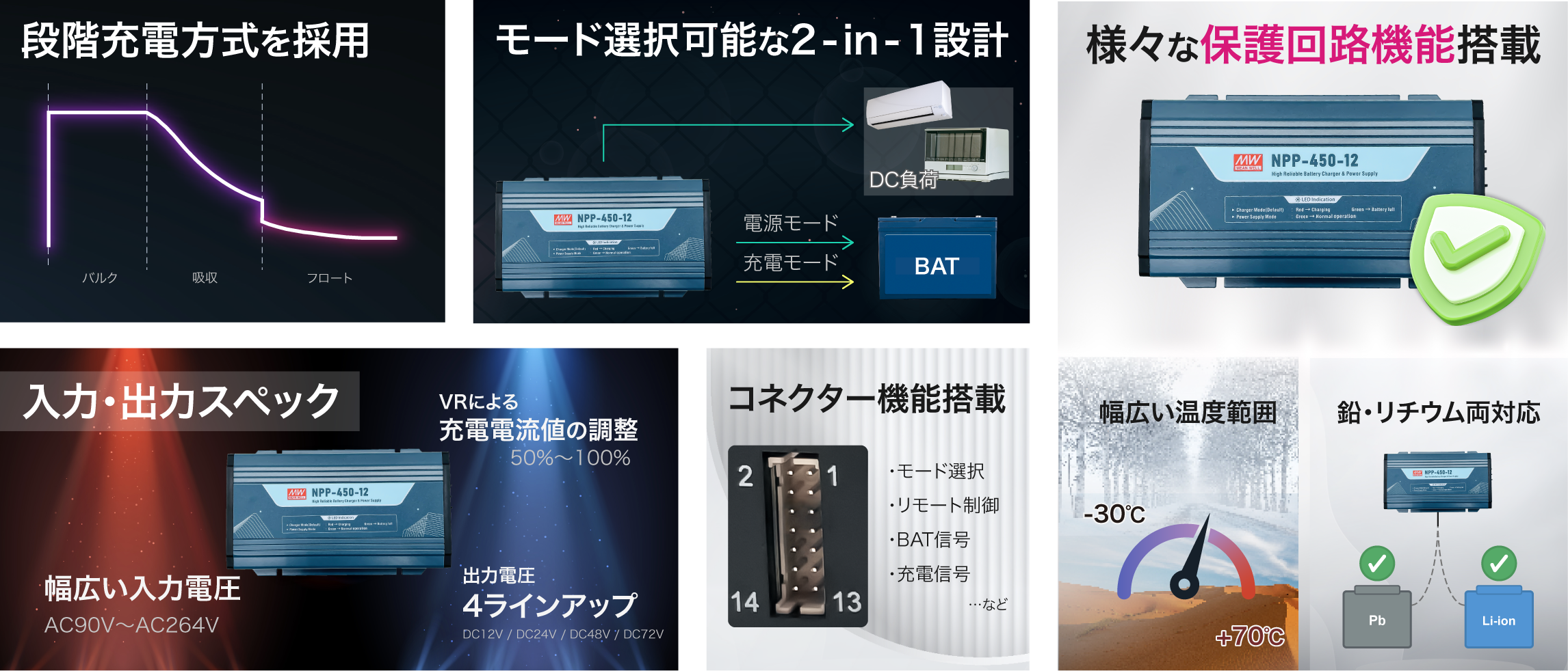 NPP Seriesは充電モードと電源モードが搭載している2-in-1バッテリー充電器です。