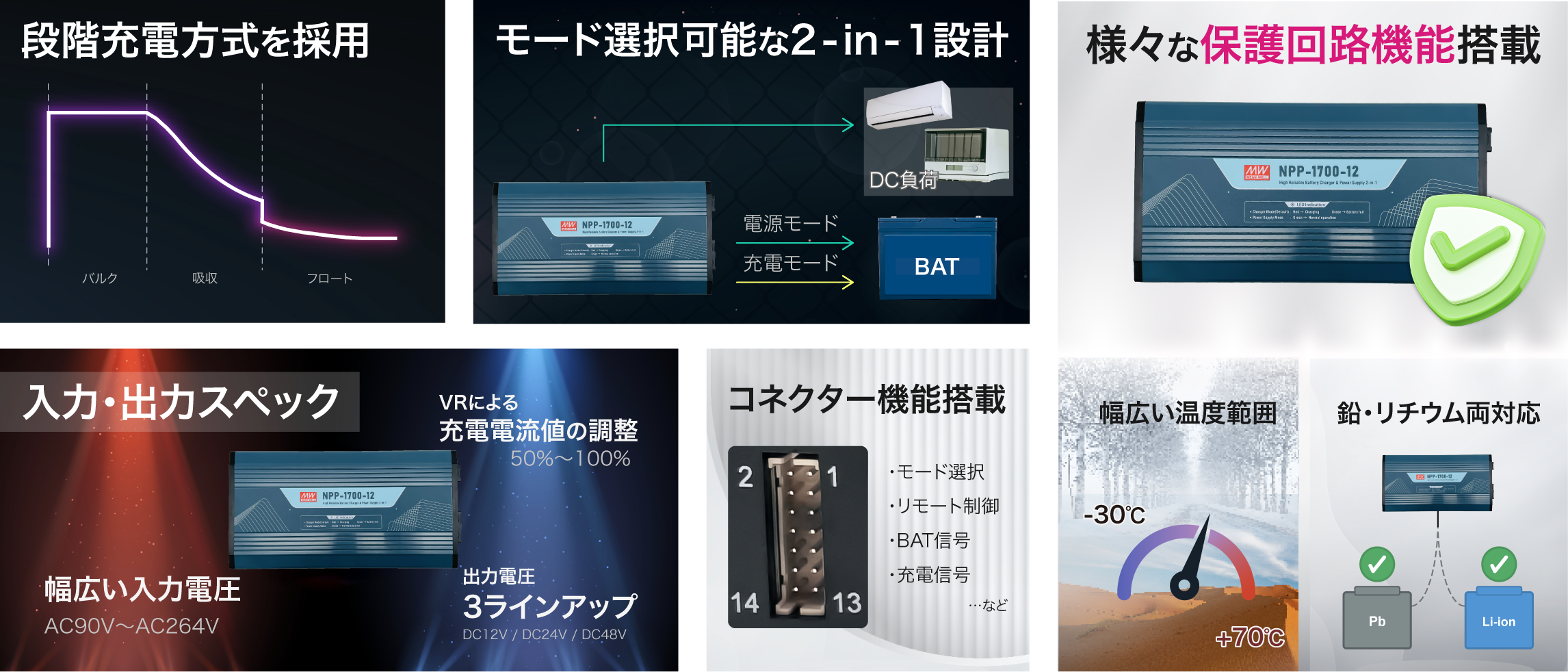 | 品名 | 1,700W High Reliable Ultra Wide Output Range Intelligent Battery Charger & Power Supply 2-in-1 |