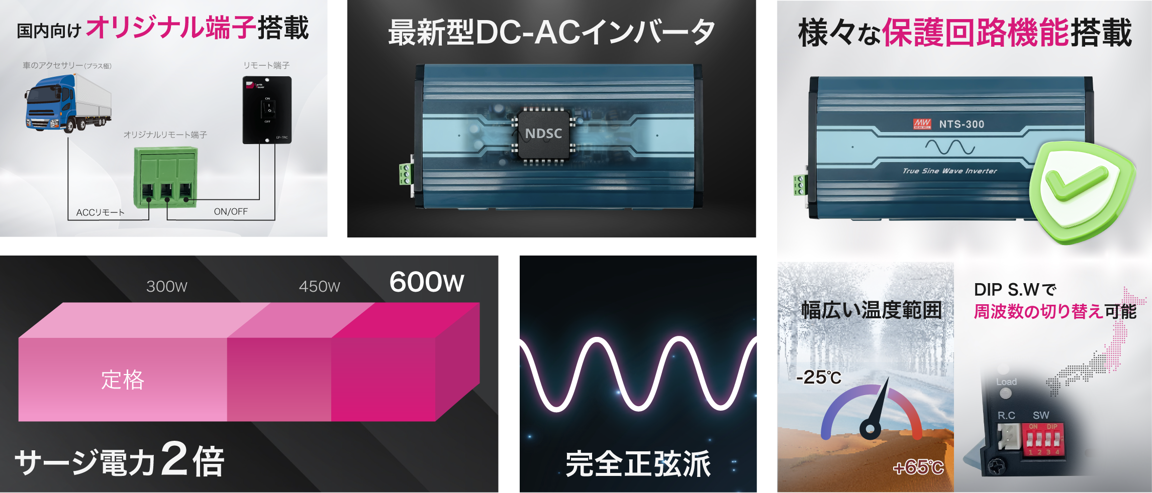 NTS-300 Seriesは最新New Digital Smart Chipsを導入したことで、小型化・軽量化・高効率化を実現させた、最新型DC-ACインバータです。