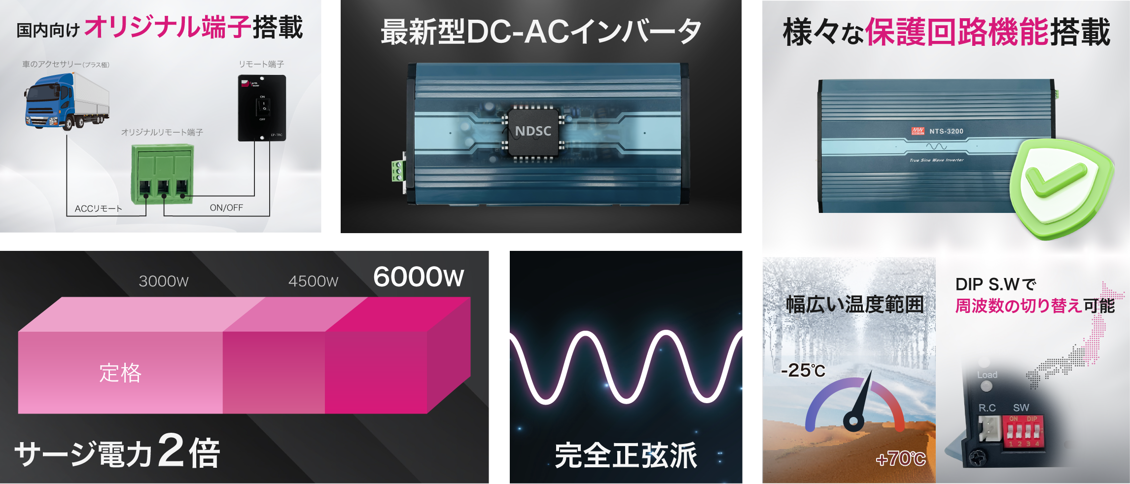 NTS-3200 Seriesは最新New Digital Smart Chipsを導入したことで、小型化・軽量化・高効率化を実現させた、最新型DC-ACインバータです。
